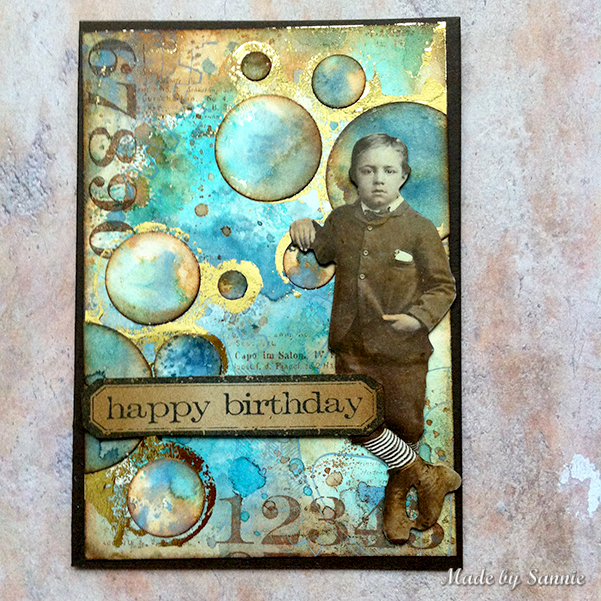 I have to wait a while before I get the new Distress color, but got inspired by it and used the colors that are close to it, I find it close;), I don't know anything about color families LOL! After stamping with the Dapper stamp set in Distress Oxide Stormy Sky and Archival Ink Coffee, I started working with the Simon Says Stamp Ring Frame to stamp with Distress Resist Spray. So happy with the result.
